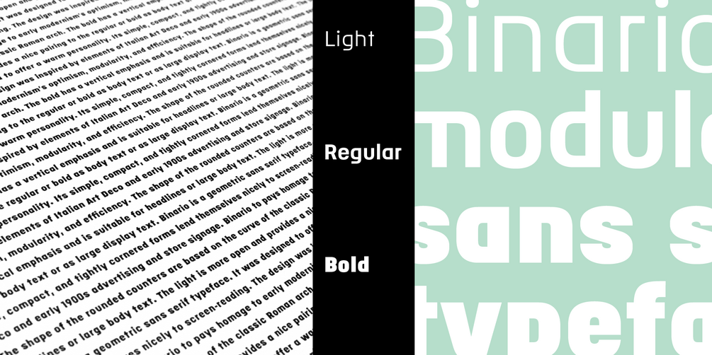Binario is a simple and friendly font with three weights and matching obliques. The geometric and modular characteristics of this typeface subtly reference the Art Deco and early modernist periods. It is an ideal choice for achieving a clean, distinctive, and contemporary aesthetic, making it suitable for branding, posters, and screen-based designs. The light weight of Binario is good for body text. The regular weight exudes confidence, making it suitable for both body and heading text. For impactful headlines, the bold weight is superb. The clear weight distinction of this family make it easy to create organized text.