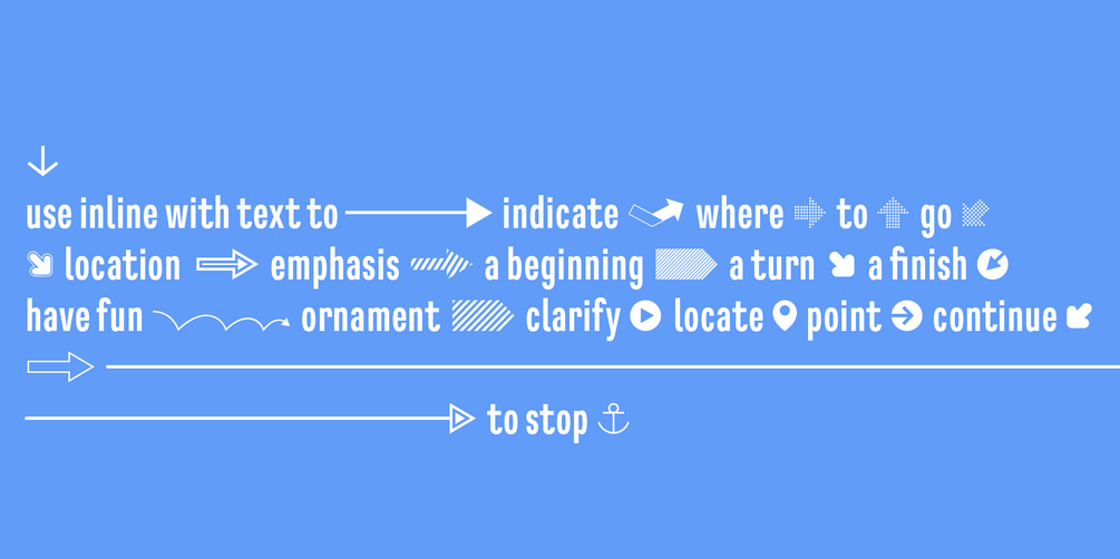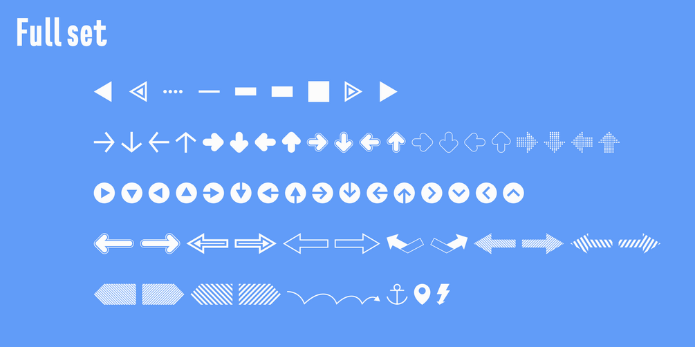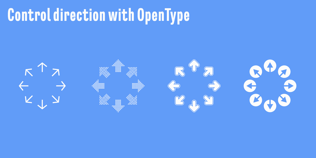 Those who use OpenType will find useful features, such as stylistic sets for changing arrow directions in 360 degree angles and stylistic alternates for quick changes between pointing right and left.